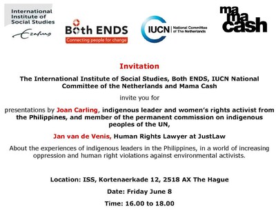 The International Institute of Social Studies, Both ENDS, IUCN National Committee of the Netherlands and Mama Cash invite you for presentations by Joan Carling, indigenous leader and women's rights activist from the Philippines and member of the permanent commission on indigenous peoples of the UN, and Jan van de Venis, Human Rights Lawyer at JustLaw, about the experiences of indigenous leaders in the Philippines, in a world of increasing oppression and human right violations against environmental activists.
