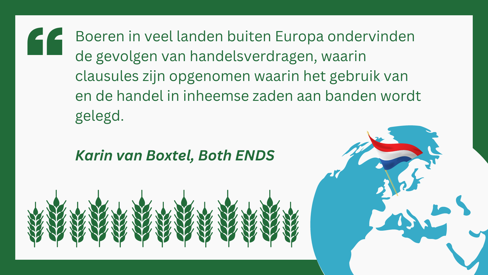 Karin van Boxtel, Both ENDS: 'Farmers in many countries outside Europe are suffering the consequences of trade agreements between their countries and the Netherlands or the EU. These agreements contain clauses limiting the use of and trade in indigenous seeds. This restricts the opportunities of small-scale farmers to adapt seeds and plants to quickly changing weather conditions and thus to ensure the supply of sufficient food.'