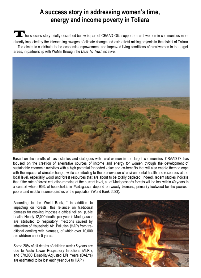 One of the livelihood initiatives was carried out by local organisation CRAAD-OI. They supported rural women in the Toliara II district by constructing boreholes in Ranobe, Benetse, and Ankililoaka, reducing their daily water collection time by 4-6 hours. This frees up time for income-generating activities, such as operating a micro-distillery in Ankililoaka that produces ethanol fuel from local sugarcane to be used in stoves. The initiative provides health and environmental benefits by reducing firewood collection and indoor air pollution, which contributes to 37 deaths daily in Madagascar. It creates new jobs, improves women’s income, and promotes alternative local development over extractivist projects, integrating marginalized women into the local economy and supporting subsistence agriculture during droughts.