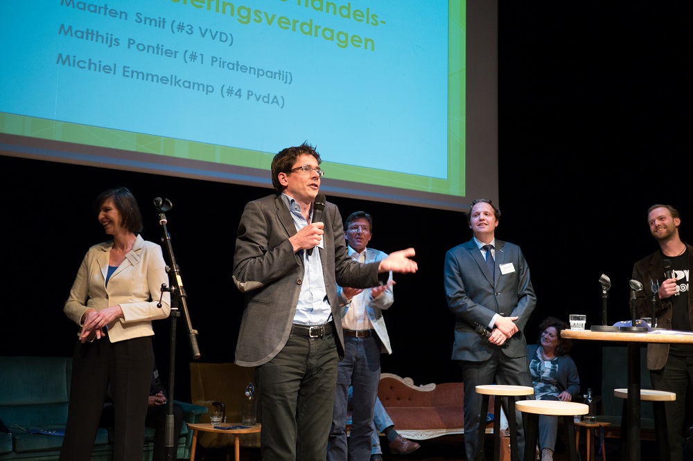 GreenLeft, the Socialist Party (SP), the Animal Party, the Labour Party and the Pirate Party are against the inclusion of the ISDS clause in TTIP. The Party for Freedom and Democracy (VVD) wants to examine whether the clause is necessary and the Christian Democratic candidate cannot be tempted to take a position tonight. Maarten Smit (VVD) stresses the economic growth that TTIP creates according to some calculations and Gerben-Jan Gerbrandy (the liberal D66) announces confidently that "Investments are good!" An axiom that is strongly contested by the audience: "There are good investments, but certainly bad ones as well", claims a gentleman in the audience.