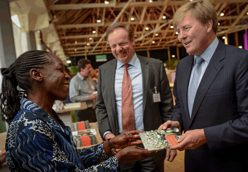 Janet Awimbo, a Kenyan ecologist, presented the first copy of the booklet 'Imagining sustainability' to HRH Prince Willem-Alexander yesterday. In the booklet, which is a co-production of Both ENDS and Cordaid, are seven interviews with thinkers from the southern hemisphere. They all envision a green and fair economy in the future. Awimbo and the Prince of Orange met at the Rio aan de Maas event in Rotterdam. At the event, Both ENDS also organised a workshop where Janet Awimbo, Paul Wolvekamp (Both ENDS) and Maarten Hajer (Bureau for Environmental planning) spoke with each other and with the audience.