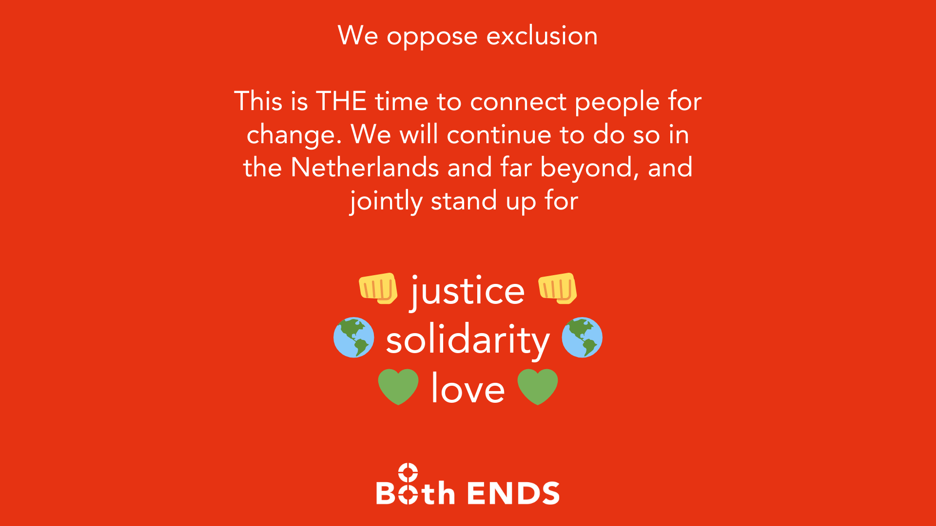 After this electoral result, Both ENDS will increase its efforts to struggle for a fair society which promotes dignity and equality of everyone. But also for our country to become a global front runner in promoting fair international economic relations and a clean and livable planet. To this end we keep connecting people for change in the Netherlands and abroad. We continue to stand up for justice, solidarity and love. Especially now.