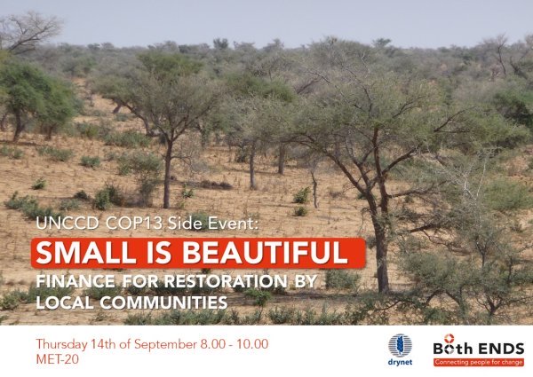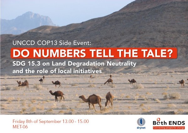 Van 6 tot 16 september vond in Ordos, China, de 13e 'Conference of Parties' van de UNCCD (UN Convention to Combat Desertification) plaats. De UNCCD is het wereldwijde verdrag van de Verenigde Naties over de bestrijding van verwoestijning en droogte. Alle landen van de wereld hebben de conventie ondertekend. Canada trok zich in 2012 terug, maar heeft in december 2016 onder leiding van de Trudeau-regering het proces voor hereniging ingezet. Both ENDS is lid van Drynet, een netwerk van lokale organisaties en gemeenschappen in droge gebieden die zoeken naar manieren om land op een duurzame manier te gebruiken.