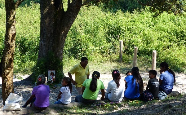 In de vroege ochtend vertrek ik naar Rio Blanco. Bij aankomst zit er een grote groep mensen op ons te wachten bij 'de eik'. In 2013 blokkeerde de gemeenschap hier wekenlang de toegang tot de rivier, waardoor de dam nu vanaf de andere kant van de rivier wordt gebouwd. Vanaf de heuvel kijken we uit over de groene velden en de beboste heuvels. Tegen de eik heeft een van de ouderen van het dorp een altaar gemaakt voor Berta. Verschillende dorpsbewoners houden een speech.