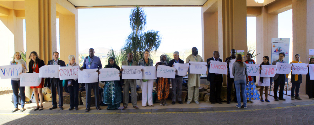 En vrijdagochtend was het zover: we stonden met onze papieren bordjes op het pleintje waar alle delegatieleden langs lopen om naar de plenaire zaal te gaan. De bordjes zeiden: why welcome the drivers of land degradation to the UNCCD? Say no to agribusiness!