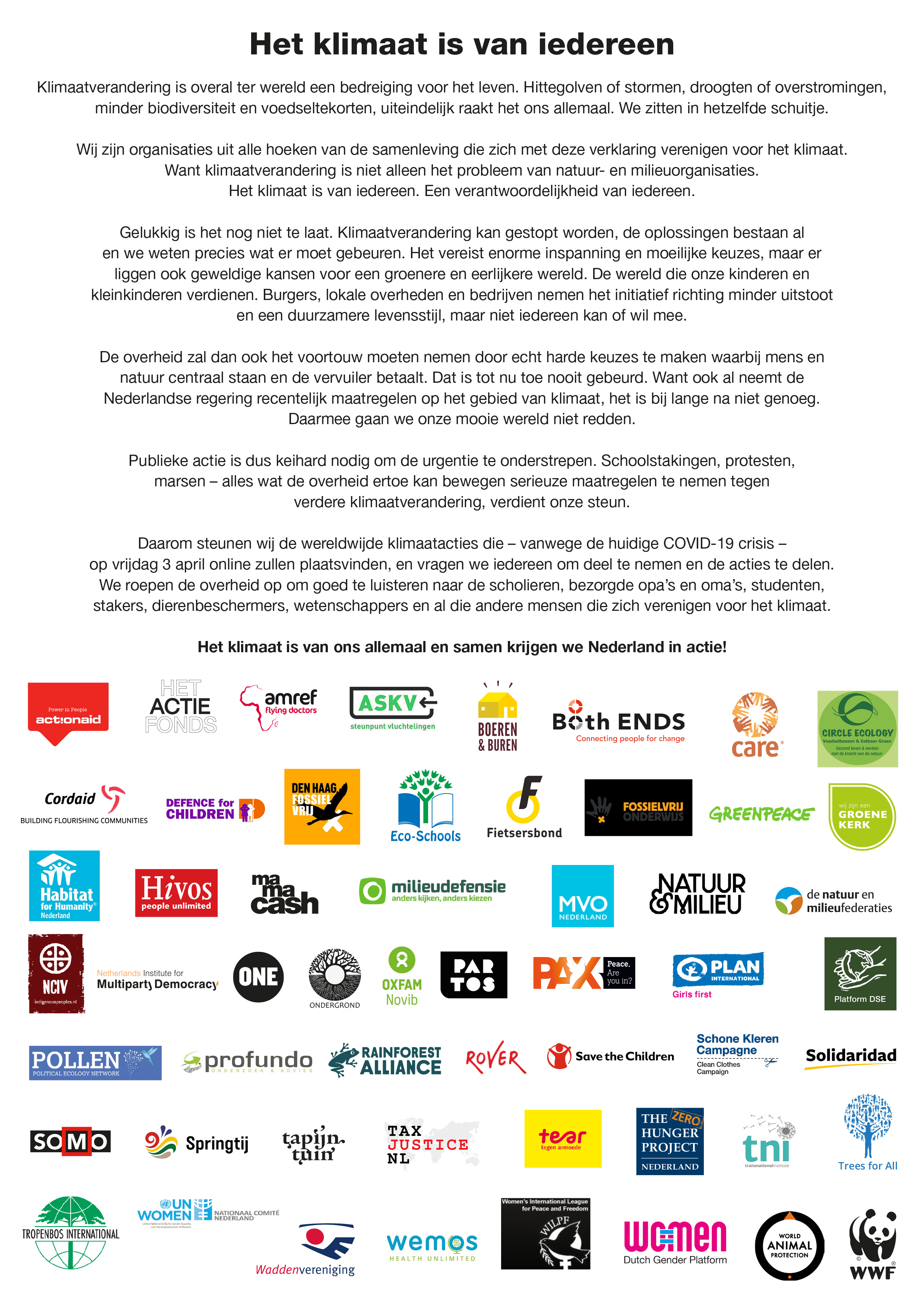 52 goede-doelenorganisaties, stichtingen en verenigingen, waarvan een groot deel zich normaal gesproken niet hoofdzakelijk met klimaatverandering bezighoudt, uiten in de verklaring 'Het klimaat is van iedereen' hun zorg over de gevaren van klimaatverandering voor alles en iedereen. Zij roepen op tot urgente actie en ondersteunen de Klimaatstaking aanstaande vrijdag 27 september in Den Haag.