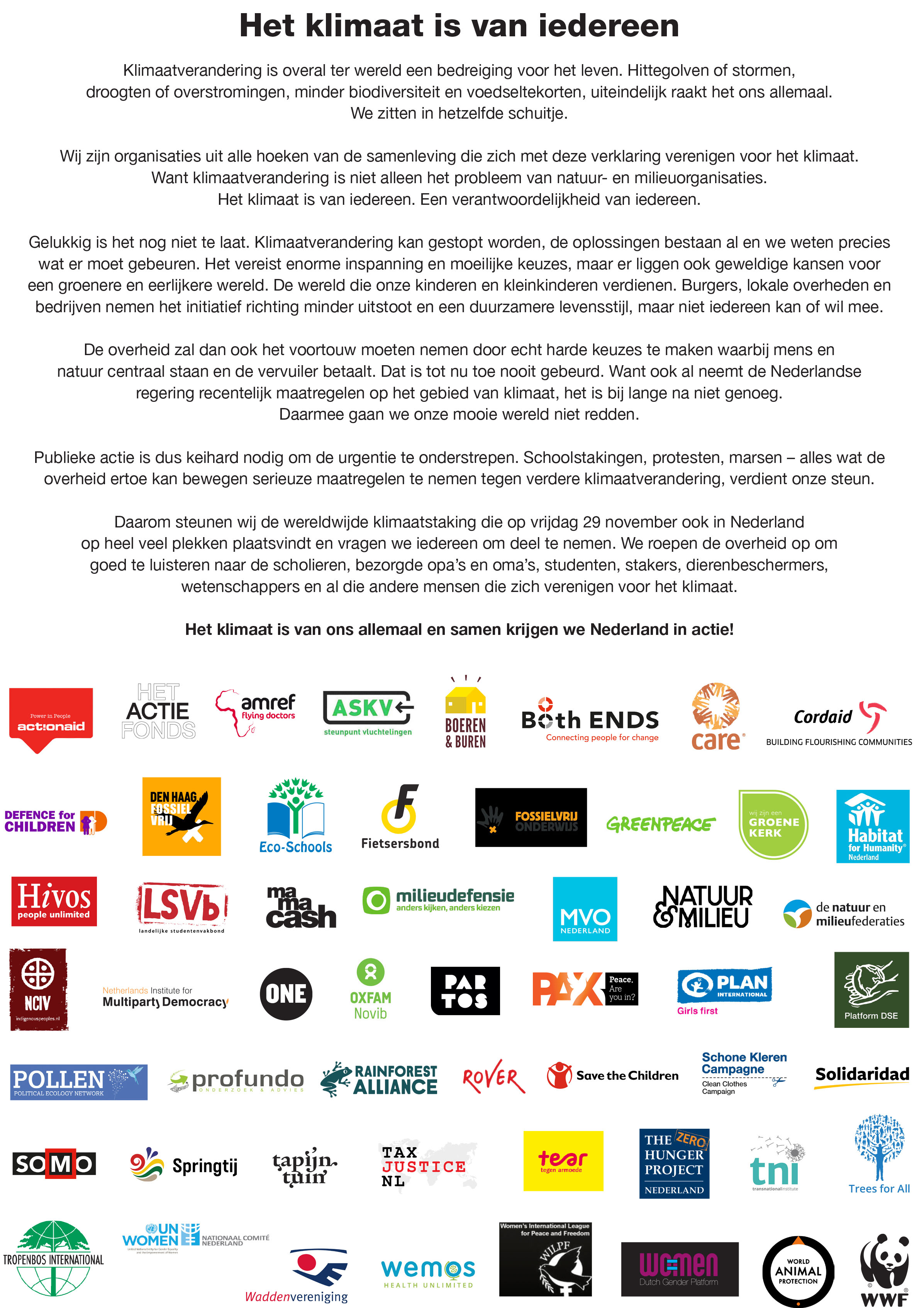52 goede-doelenorganisaties, stichtingen en verenigingen, waarvan een groot deel zich normaal gesproken niet hoofdzakelijk met klimaatverandering bezighoudt, uiten in de verklaring 'Het klimaat is van iedereen' hun zorg over de gevaren van klimaatverandering voor alles en iedereen. Zij roepen op tot urgente actie en ondersteunen de Klimaatstaking aanstaande vrijdag 27 september in Den Haag.