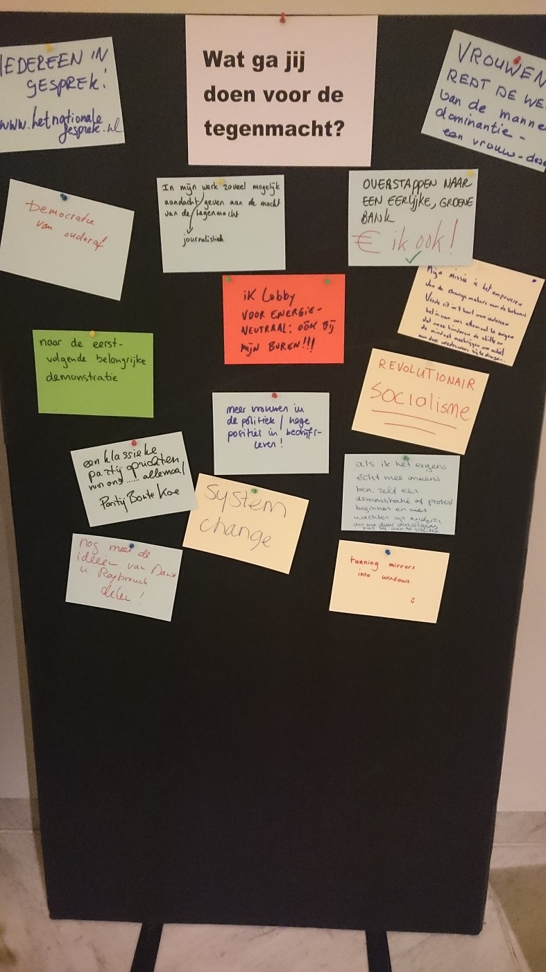 Ondanks deze serieuze oproepen is de avond echt een hommage aan de tegenmacht. De avond wordt muzikaal opgeluisterd door het Breathing Ensemble onder leiding van Orville Breeveld, dat prachtige (protest)liederen ten gehore brengt. Zelfs in de pauze en in de wandelgangen is iedereen druk aan het discussiëren, de actiemuur met inspirerende boodschappen wordt al voller en voller en je moet in de rij staan om een petitie te tekenen. Energie genoeg deze avond!