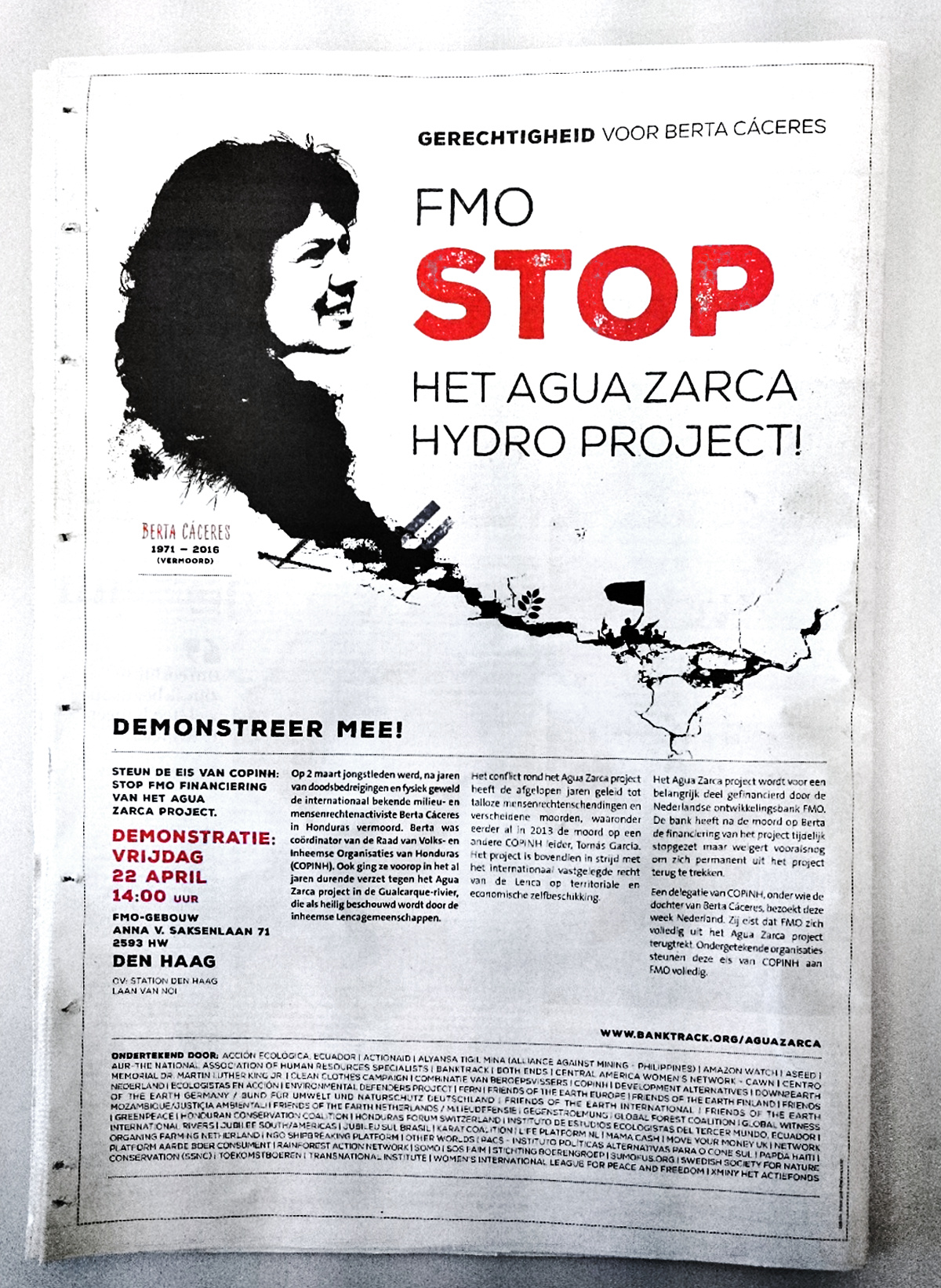 • Vrijdag 22 april om 14:00: demonstratie (voor iedereen toegankelijk) voor het FMO-hoofdkwartier, Anna van Saksenlaan 71, 2593 HW, Den Haag