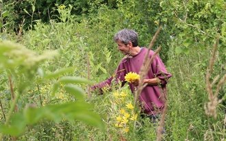 "Wij zijn 12 jaar geleden begonnen met de aanleg van ons voedselbos. Toen was het nog een grote kale, lege akker. Het is ongelooflijk om te zien wat een enorme biodiversiteit hier is ontstaan. In eerste instantie hebben Wouter (van Eck – red.) en ik veel tijd geïnvesteerd in het uitzoeken welke gewassen het goed bij elkaar zouden doen. Dat was een proces van steeds proberen, andere gewassen testen, veel leren en natuurlijk veel fysieke arbeid. De akker beplantte zich niet vanzelf. Maar maar inmiddels bedruipt het voedselbos zichzelf al vele jaren en heeft het geen of nauwelijks onderhoud nodig. Wij – en restaurant De Nieuwe Winkel natuurlijk – plukken er letterlijk vooral de vruchten van."