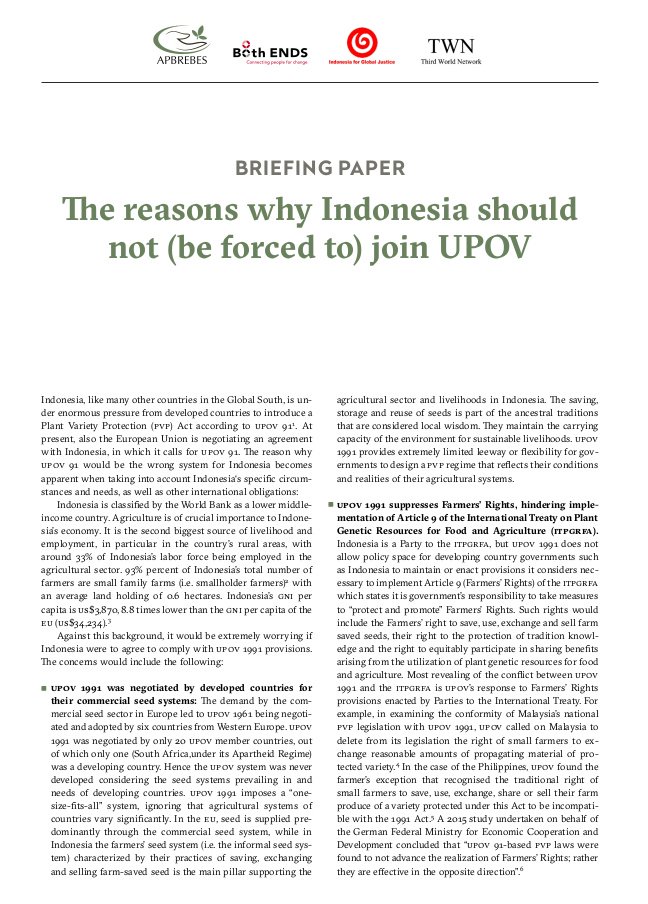The briefing paper highlights the main arguments why Indonesia should not join UPOV - and why it should not be pressured to do so by its northern trading partners.