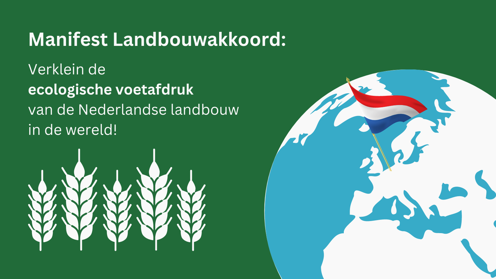 Het Nederlandse Landbouwakkoord, dat nu wordt ontwikkeld, is te veel alleen op Nederland gericht. Dat vindt een brede coalitie van meer dan zestig NGO's, boerenorganisaties, wetenschappers en bedrijven die vandaag een brandbrief stuurde aan ministers Adema (LNV) en Schreinemacher (BuHaOS). Het Nederlandse landbouwbeleid moet zich ook richten op het verkleinen van de grote Nederlandse agrarische voetafdruk in landen buiten Nederland, door voedselzekerheid en behoud van biodiversiteit als startpunt te nemen. De coalitie publiceerde een manifest waarin zij uiteenzet hoe de hervorming van het Nederlandse agrarische buitenlandbeleid eruit zou kunnen zien.