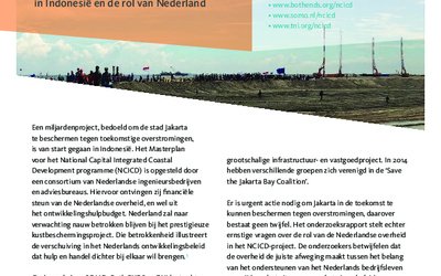 21 april 2017: Jakarta zinkt. Door excessief oppompen van grondwater zakt de miljoenen-stad met tientallen centimeters per jaar en wordt zo kwetsbaarder voor overstromingen. Nederlandse bedrijven bedachten een oplossing: een enorme zeewering voor de kust, tevens een prachtig vastgoedprject. Maar deze ingreep is een schijnoplossing, zeggen onderzoekers van Both ENDS, Stichting Onderzoek Multinationale Ondernemingen (SOMO) en het Transnational Institute (TNI) vandaag in een nieuw rapport. Sterker nog, tienduizenden mensen werkzaam in de lokale visserijsector dreigen hiermee hun broodwinning te verliezen.